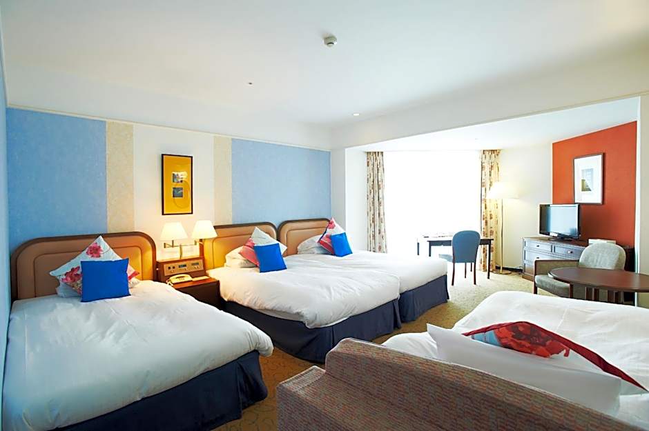 Triple Room, Non-Smoking (South Building, South Resort Floor) (2 Twin Beds and 1 Twin Murphy Bed) is 420 square feet and includes 3 single beds 80-130 width plus balcony, desk, hairdryer, safe, and slippers.